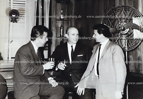 Grand Prix von Argentinien 1961, Rainer Günzler, Juan Manuel Fangio und Hans Herrmann im Gespräch, 15x22cm, dazu Teilnehmerpin, guter Zustand