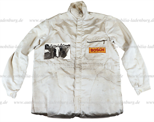 Feuerfester Fahreranzug „Bosch“ von Hans Herrmann, gertragen wurde der Overall unter anderem bei Testfahrten mit dem Porsche 917, dazu original s/w Aufnahme, Hans Herrmann bei Testfahrten auf Porsche 917 mit dem hier angebotenen Anzug, rechts neben Herrmann ist Peter Falk zu sehen...