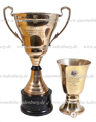 15.09.1963, Konvolut 2tlg., darunter Siegerpokal „2. Timmelsjoch Hochalpen-Bergrennen 1963 SP-2000 I.“, Höhe 20,5cm; Siegerpokal „2.Timmelsjoch Hochalpen-Bergrennen 1963 Bergrekord Trophäe der Timmelsjoch Hochalpenstrasse AG.“, Höhe 41.5cm Hans Herrmann auf Abarth 2000SP, 1.Platz in der Klasse,... mehr