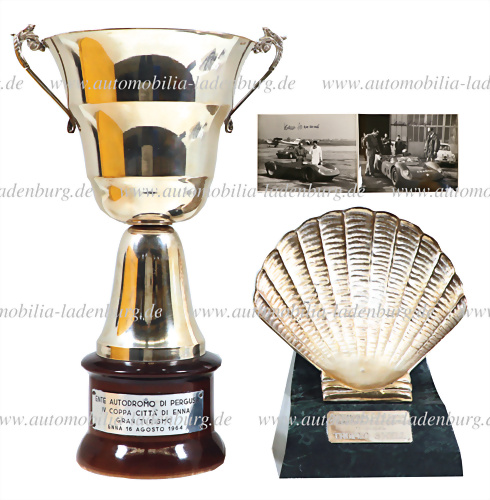 16.08.1964, Konvolut darunter 2 Siegerpokale (Silber 800), „Automobile Club Enna 3.Gran Premio Mediterraneo 16.08.1964 Trofeo Shell“, Höhe 20,5cm, sowie „Ente Autodromo di Pergusa IV Coppa Citta di Enna Gran Turismo Enna 16.Agosto.1964“, Höhe 34,5cm, Hans Herrmann auf Abarth 2000GT, 1.Platz in der... mehr