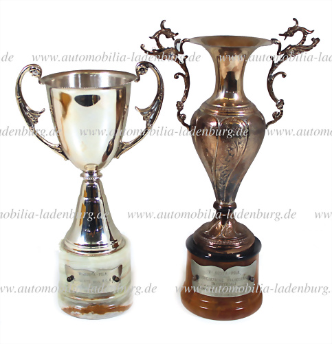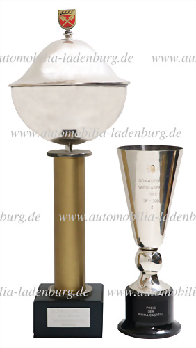17.10.1965, Konvolut Siegerpokal „Donaupokal Wien-Aspern 1965“ verliehen von „Alfred Brudl Alfa Romeo Landesvertretung Salzburg“, Höhe 51cm; Siegerpokal „Donaupokal Wien-Aspern 1965 SP-2000 II.“, Höhe 29cm, Hans Herrmann auf Abarth 2000OT, 2.Platz in der Gesamtwertung