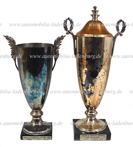 06.06.1965, Konvolut 2tlg., darunter Siegerpokal „Association Sportive del A.C.Vauclusien Mont Ventoux 1965“, Höhe 38cm; Siegerpokal „Coupe du Conseil General de Vaucluse Mont Ventoux 1965“, Höhe 49,5cm, Hans Herrmann auf Abarth 2000OT, 1. Platz in der Klasse, sowie 1. Platz in der Gesamtwertung