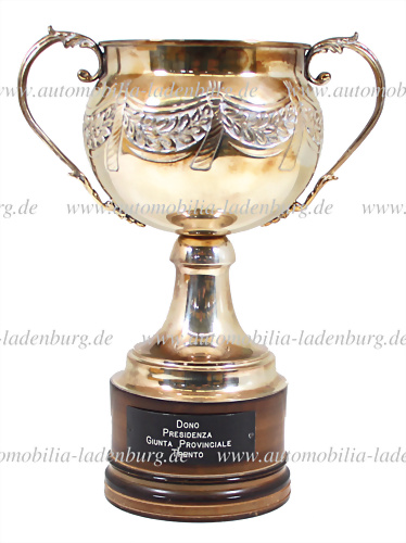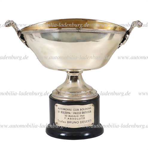 30.05.1965, Siegerpokal (Silber 800), „Automobile Club Bologna IX. Bologna – Passo Raticosa 30.Maggio.1965 1. Assoluto Trofeo Bruno Deserti“, Höhe 22,5cm, Hans Herrmann auf Abarth 2000OT, 1.Platz in der Klasse, sowie 1.Platz in der Gesamtwertung