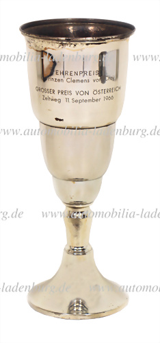 11.09.1966, Siegerpokal „Ehrenpreis d. Prinzen Clemens von Croy Großer Preis von Österreich Zeltweg 11 September 1966“, Höhe 43,5cm, Hans Herrmann und Gerhard Mitter auf Porsche 906 (#906.128), 1. Platz in der Klasse, sowie 1.Platz in der Gesamtwertung