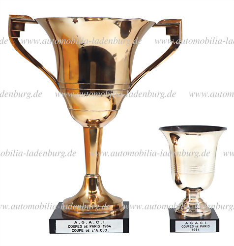 20.09.1964, Konvolut 2tlg., darunter Siegerpokal „A.G.A.C.I. Coupes des Paris 1964 – Coupe de L´A.C.O.“, Höhe 32cm; Siegerpokal „A.G.A.C.I. Coupes de Paris 1964“, Höhe 15cm, Hans Herrmann auf Abarth 1000TC, 1.Platz in der Klasse, 1.Platz in der Gesamtwertung, sowie Hans Herrmann auf Abarth 2000GT,... mehr