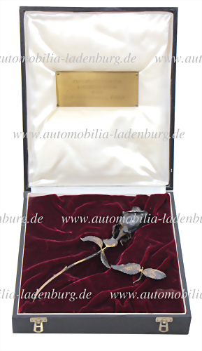 02.10.1966, Siegertrophäe Rose in Etui „Flugplatzrennen Langenlebarn 1966 Rosen-Starkl Tulln“, Maße Etui 26x22x6,5cm, Hans Herrmann auf Porsche 906, 1.Platz, (2 Blätter an der Rose gebrochen, sollte restauriert werden)