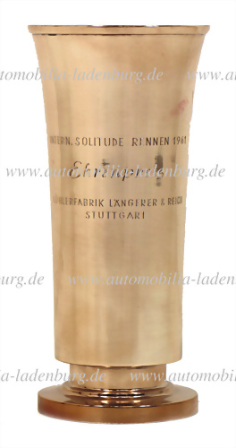 23.07.1961, Silberpokal (Silber 925) „Internationales Solitude Rennen 1961 Ehrenpreis Kühlerfabrik Längerer & Reich Stuttgart“, Höhe 20,5cm, Hans Herrmann auf Porsche 718, 6.Platz in der Gesamtwertung