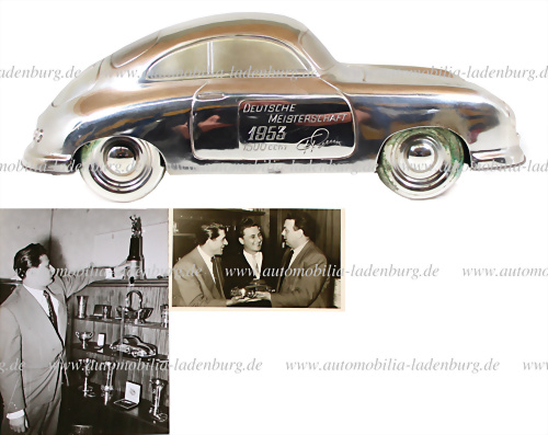1953, persönliches Geschenk von Ferry Porsche an Hans Herrmann anlässlich sportliche Erfolge in der Klasse bis 1500ccm, Silbermodell (835 Silber) Porsche 356 mit Gravur „Deutsche Meisterschaft 1953 1500ccm F.Porsche“, 35x16,5x11cm, dazu 2 original s/w Aufnahmen, 8,5x13,5cm, sowie 18x13cm, Rarität