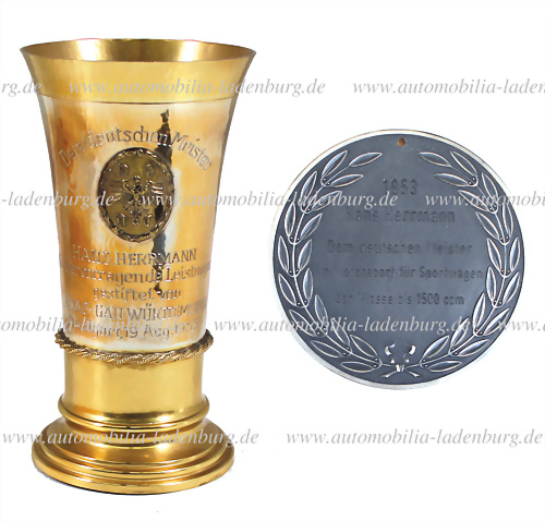 12.12.1954, Silberpokal (Silber 825), „ADAC-Siegerehrung 12.12.54 Bad Ems – Unserem verdienstvollen Clubkameraden Hans Herrmann dem deutschen Meister 1954 der Rennsportwagen 1500ccm“, Höhe 20,5cm, Hans Herrmann auf Porsche