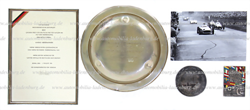 1954, Konvolut 2tlg., darunter Silberteller (Silber 800), „Hans Herrmann deutscher Meister 1954 Rennsportwagen 1500ccm – Deutsches Dunlop Gummi Compagnie AG. Hanau / Main“, Durchmesser 32,5cm, dazu Plakette „1954 Hans Herrmann dem deutschen Meister im Motorsport für Rennsportwagen der Klasse bis... mehr