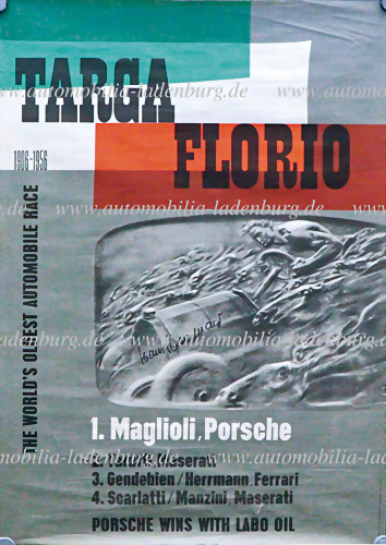 10.06.1956, handsigniertes Rennplakat „Targa Florio 1906-1956“, Entwurf Werbeagentur Strenger, signiert von Hans Herrmann, 84x59cm, kleinere Einrisse an den Rändern, sowie kleinere Löcher auf dem Plakat, Hans Herrmann / Olivier Gendebien auf Ferrari 290MM (#0616MM), auf dem 3.Platz hinter Umberto... mehr