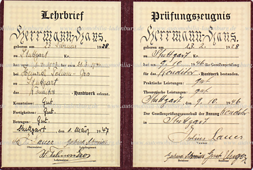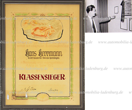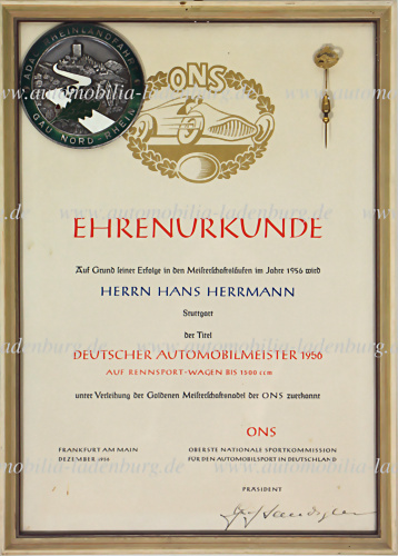 1952, gerahmte Urkunde des Automobil und Motorsport Club Stuttgart für „Erfolge in der Klasse bis 1500ccm“, 43x33cm, dazu original s/w Aufnahme Hans Herrmann mit der Urkunde in den 50er Jahre, 13x18cm