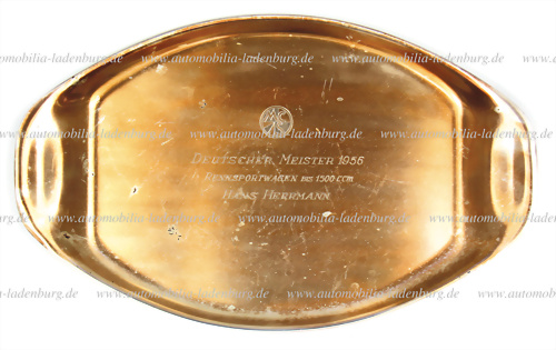 Motorsport Club Stuttgart, Silberschale (WMF) mit Gravur „Dem deutschen Meister 1956 – Rennsportwagen bis 1500ccm – Hans Herrmann“, 26x42cm, Hans Herrmann auf Porsche 550 Spyder