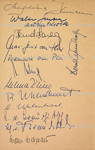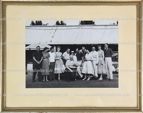 Handsignierte gerahmte original s/w Aufnahme, Mercedes Benz Rennmannschaft 1955, handsigniert von Rudolf Uhlenhaut, Frau Uhlenhaut, Hans Herrmann und Freundin Helga, Stirling Moss, Juan Manuel Fangio, Andrea Berruet, Karl Kling, Wilma Kling, Andre Simon, John Fitch, 27x34cm (Signaturen leicht... mehr