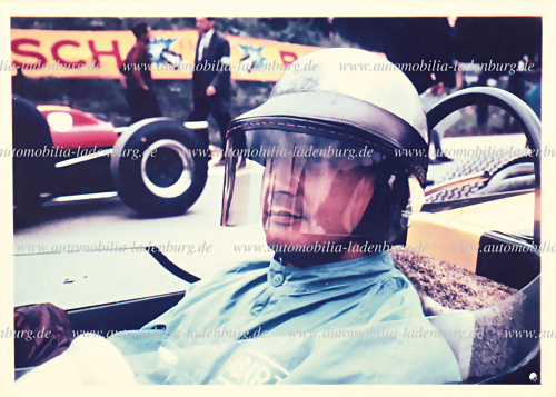 1966, original Farbaufnahme, Hans Herrmann im Cockpit des Brabham BT18 F2, wohl Nürburgring, 13x18cm