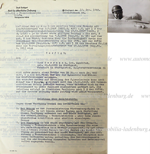 13. Dezember 1949, 4 Seiten Verfügung der Stadt Stuttgart Amt für öffentliche Ordnung, hier wird Hans Herrmann für zahlreicher Vergehen im Straßenverkehr der Führerschein entzogen...darunter das flüchten vor der Polizei...dazu ein Porträtfoto Hans Herrmann am Steuer eines Porsche 550 Spyder