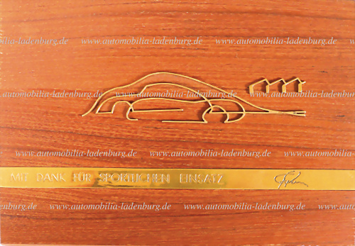 ca. 1960, Holztafel mit Messing Applikation „Liebe zu Ihm“ und Schriftzug „Mit Dank für sportlichen Erfolg“ und Faksimile Gravur Ferry Porsche, 15x22cm