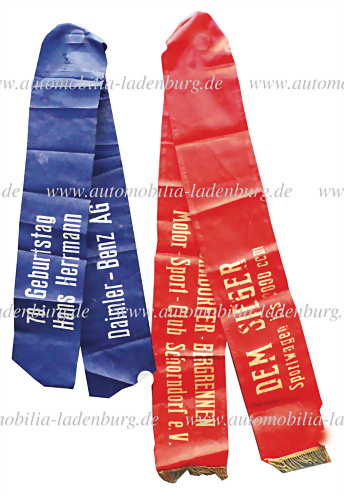 Konvolut 2tlg., darunter Siegerschleife „Schorndorfer Bergrennen“, 1960 auf Porsche RS60, dazu „Siegerschleife der Daimler Benz AG – zum 70. Geburtstag“, guter Zustand
