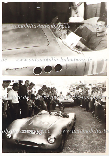 Siegerschleife „Dem deutschen Meister 1954 – Rennsportwagen bis 1500ccm – Automobilclub von Deutschland e.V.“, Hans Herrmann auf Porsche 550 Spyder, dazu original s/w Aufnahme, Hans Herrmann mit Porsche Monteuren am Porsche 550 Spyder