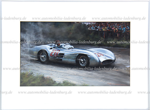 Ölgemälde von Georg Baumhakl, Öl auf Leinwand, Hans Herrmann auf Mercedes Benz W196, Grand Prix Frankreich 1954, gerahmt im Passepartout, 62x80cm