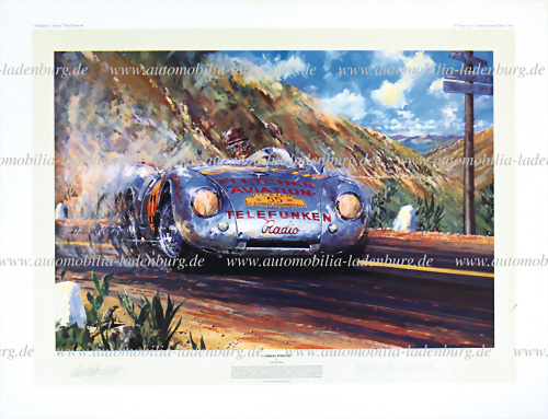 Handsignierter Kunstdruck „Carrera Porsche“ von Nicholas Watts, Motiv Hans Herrmann auf Porsche 550 Spyder, Carrera Panamericana 1954, signiert von Nicholas Watts und Hans Herrmann, 63,5x82cm