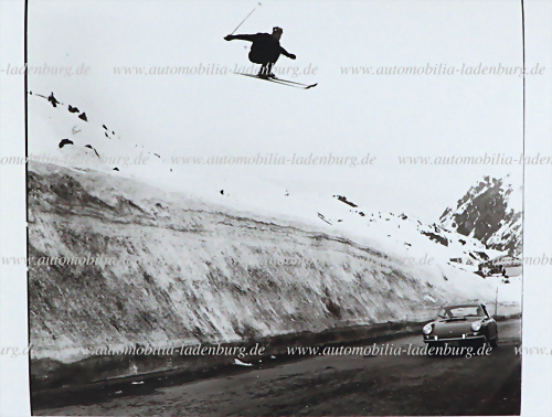 Original s/w Aufnahme von Star-und Pressefotograf Hans Truöl, Skisprung über die Straße im Hintergrund das Porsche 911, 18x24cm, gestempelt "Foto-Reporter Hans Truöl / Gerd Pfeiffer München", schöne Aufnahme