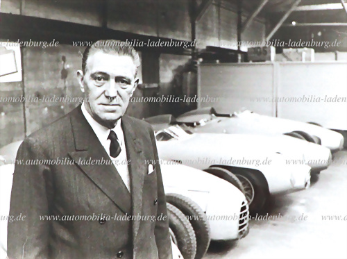 Original s/w Aufnahme Aldo Gordini im Hintergrund die Gordini Rennwagen, 18x24cm, gestempelt "Photo Tessyre / International Magazine Service Stockholm", schöne Aufnahme