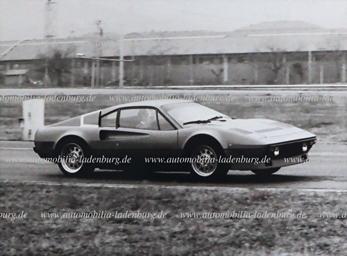 Original s/w Aufnahme Ferrari 308 GTB, bei Testfahrten, 18x24cm, gestempelt "Hans G. Lehmann"