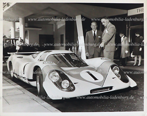 Original s/w Aufnahme Gulf Porsche 917, daneben Carlton Tower, I.G.Davis und John Wyer, 18x24cm, gestempelt "Fox Photos"