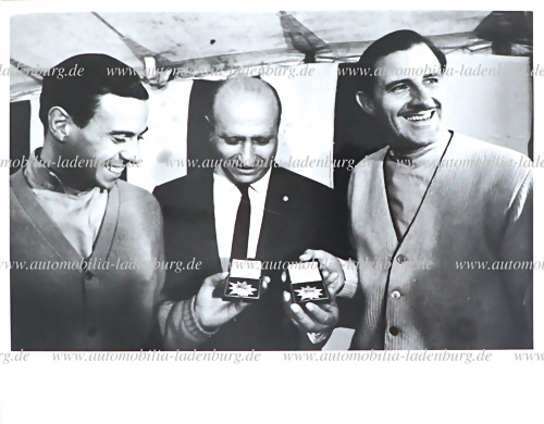 Original s/w Aufnahme Jim Clark neben Juan-Manuel Fangio und Graham Hill, 18x24cm