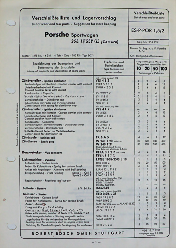 Einblattprospekt Robert Bosch GmbH Stuttgart "Verschleißteilliste und Lagervorschlag" Porsche Sportwagen 356A / 1500 GS Carrera
