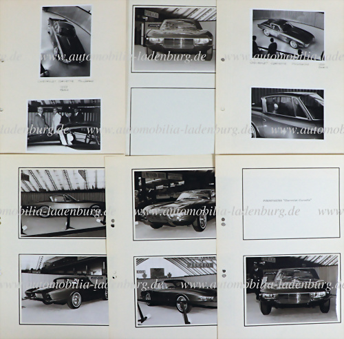 Konvolut 10 original s/w Aufnahme Chevrolet Corvette Carrozzeria Pininfarina, Messestand Paris 1963, 10,5x14,5cm, Aufnahmen aufgeklebt auf Albumseiten