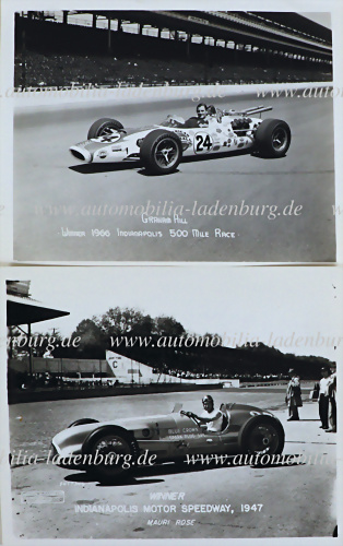Konvolut 2 original s/w Aufnahmen Indianapolis 500, u.a. Sieger Graham Hill 1966, Mauri Rose 1947, 20x25cm, gestempelt "Indianapolis Motor Speedway"