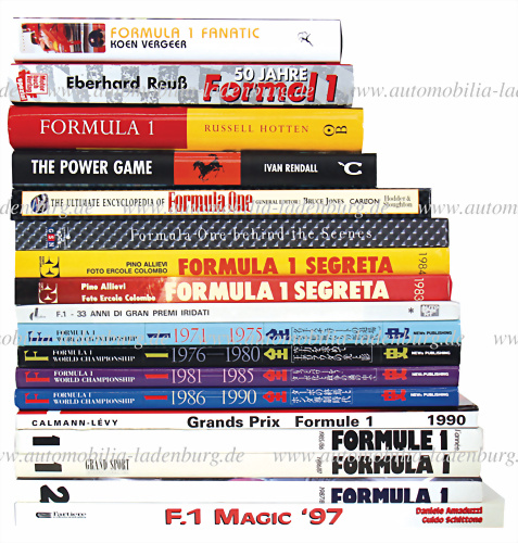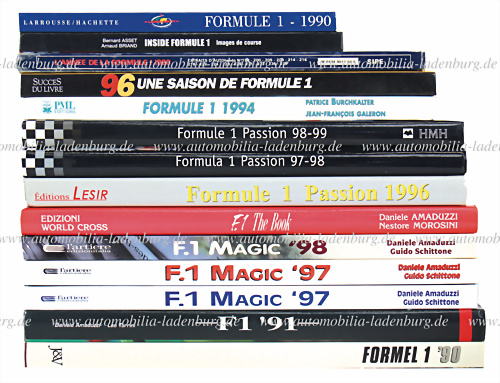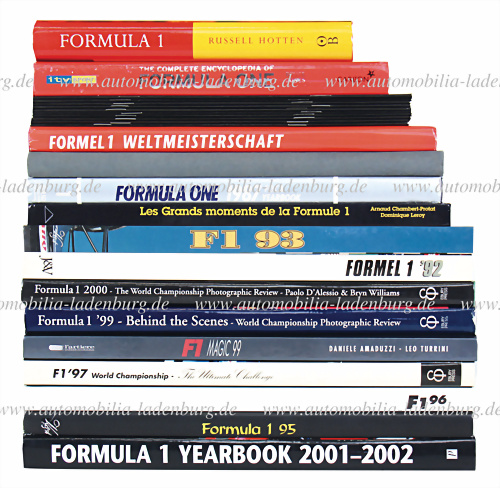 Bücherkonvolut 14tlg. darunter z.B.: „F1 Magic `97/ 98”, sowie „F1 The Book” von D. Amaduzzi; drei Bände „Formula 1 Passion” 96-99; „L`Annee De La Formule I 1980”, etc. versch. Sprachen, weitere Titel entnehmen Sie Bitte unserem Katalogbild