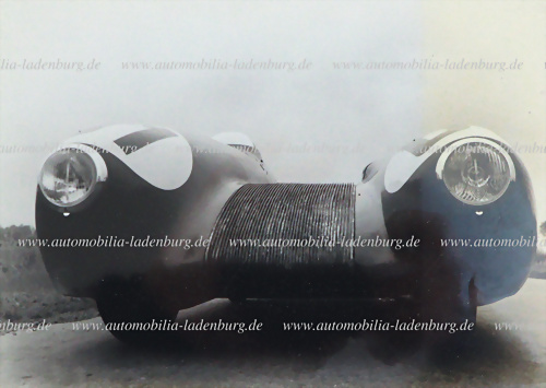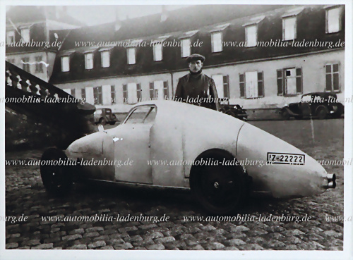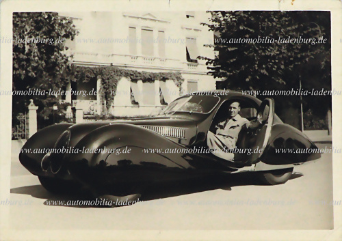 1934, s/w Aufnahme (Abzug 50er Jahre), Kurt C Volkhart mit dem Imperia Stromlinienwagen, 11,5x15,5cm