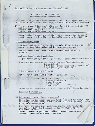 Carrera Panamericana Mexiko 1952, 94 Seiten, interne Dokumente betreffend des Einsatzes in Mexiko, und technische Details zu den Mercedes Benz 300 SL Rennsport W194, darunter Reiseplan und Termine, interne Aufzeichnungen über den Verbleib und die damalige Verwendung der Fahrgestellnummern mit... mehr