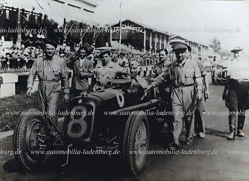 original s/w Aufnahme (Posthumus), Tazio Nuvolari im Maserati 6CM neben dem Wagen sind Ettore Maserati und Guerino Bertocchi zu sehen, Grand Prix Italien 1934, 18x24cm