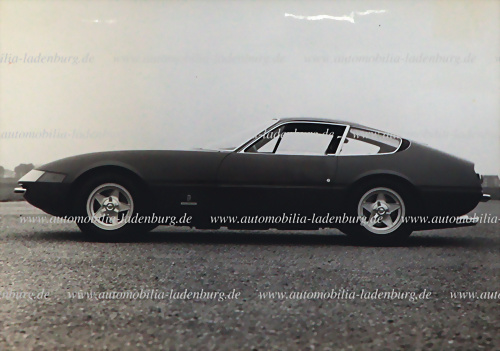 original s/w Werksfoto, Ferrari 365 GTB/4 "Daytona", rückseitig gestempelt "Carrozzeria Pininfarina", 13x18cm