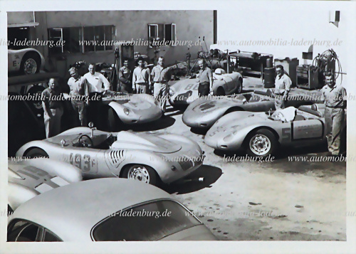 ca. 1960, original s/w Aufnahme, Vasek Polak mit Mitarbeitern und zahlreichen Porsche RSK sowie 550 Spyder, 356 South Sepulveda Blvd., Manhattan Beach, Kalifornien, 13x18cm