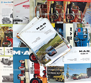 Konvolut 31 tlg. 70er Jahre Verkaufsprospekte /- Kataloge Nutzfahrzeuge, darunter Katalogmappe 1970, mit 14 Prospekten; Programm 1973; Sattelzugmaschinen 16-22 t.; Pritschenwagen 16-22 t.; F130-F150; Möbel- & Kofferwagen; etc. de./ fr. Text, guter Zustand.