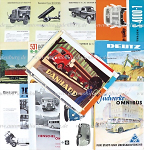 Konvolut 35 tlg, 40er-60er Jahre Verkaufsprospekte/ Kataloge Nutzfahrzeuge, darunter u.a.: Ernst Grube S40001; Borgward 4 Tonnen; Goggomobil Kleintransporter; Henschel Omnibusse & Trolley Bus; Saurer 5D; Krupp 360 & Mustang; Atlas 800, etc. fr./ de. Text, guter Zustand