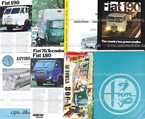 Konvolut 18 tlg. 60er-70er Jahre Verkaufsprospekte/-Pressemappen Alfa Romeo & Fiat Nutzfahrzeuge, darunter 1963 Alfa Romeo Autobus Pressemappe, innen mit 3 Werksfotos, gestempelt "Carosserie Desot"; Alfa Romeo Pressemappe innen mit 12 Prospekten, sowie FNM D11000 Spezifikationen und Werksfoto; Autobus 800/900A; Fiat 190 etc. fr./ ital./ en. Text, tw. mit Gebrauchsspuren