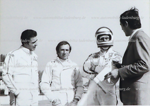 original s/w Aufnahme, Peter Schetty, Silvio Moser, Clay Regazzoni und Ing. Giorgio Ferrari, datiert 23. Oktober 1971, gestempelt Galante Gaspare, Peter Schetty war ab 1971 als Rennleiter bei der Scuderia Ferrari tätig, schönes Foto, 10,5x14cm