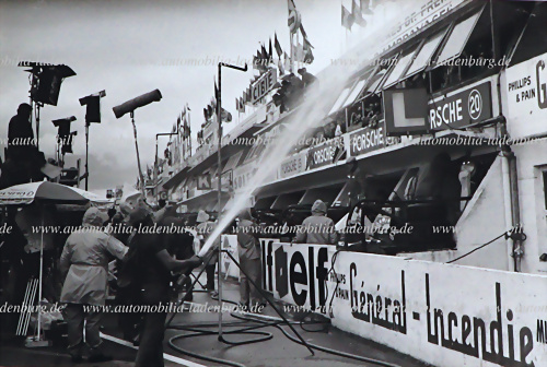 Le Mans 1970, original s/w Aufnahme, Dreharbeiten zum Film "Le Mans" (Steve McQueen), die Filmcrew setzt die Porsche Box unter Wasser...13x18cm
