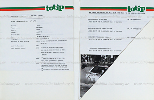 1988, Pressemappe "Jolly Club - Totip Team", Lancia Delta 4WD Gr.A, vollständig mit Pressefotos, engl. Text, guter Zustand