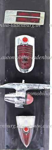Konvolut 4 Rücklichter u.a. für Packard 1947; Lincoln 1951; Imperial 1955-56; Cadillac 1952, auf Holzdisplay montiert