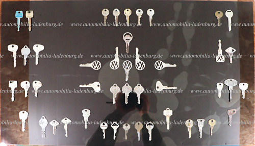 Display mit ingesamt 46 Zündschlüssel 50er - 60er Jahre, darunter zahlreich Schlüssel für Volkswagen; Ford Taunus, Ford Mustang, SEAT, Chrysler, Hudson, GM, Falcon, Lloyd, Audi