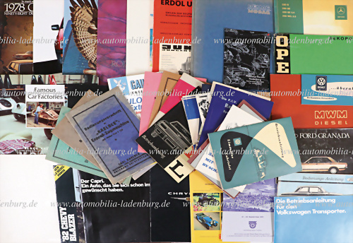 Konvolut Verkaufsprospekte, Bedienungsanleitungen..., darunter z.B. Betriebsanleitung Mercedes-Benz 280S / SE / SE 3.5 / SEL 3.5; Fiat 600D; Opel Dipolomat V8; Ford Taunus 12M; Ford Granada; Gmeinder Dieselmotoren Lokomotiven; MWM Diesel; Mercedes-Benz OM315; Kälble Dieselmotoren F125; Opel Rekord;... mehr