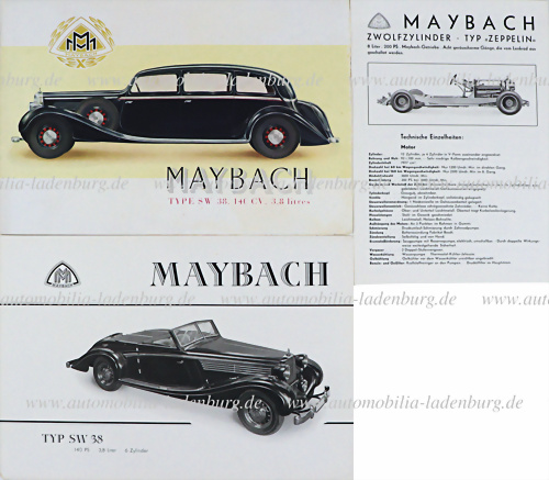 Konvolut 3tlg., darunter Verkaufsprospekt Maybach Typ SW 38, 4 Seiten deutscher Text, dazu Faltprospekt Maybach Type SW38, franz. Text, sowie technisches Datenblatt Maybach Typ Zeppelin