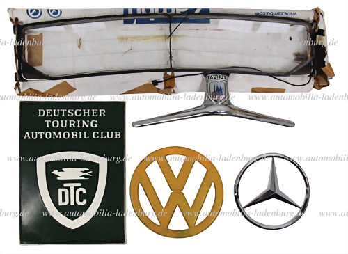 Konvolut darunter Blechschild (bemahlt) "Deutscher Touring Automobil Club", 50x36cm; Embelm für VW T1, Durchmesser 32cm; Kühleremblem für Mercedes-Benz L311, Durchmesser 26cm; Emblem für Ford Buckeltaunus 1950, 15,5x54,5cm, sowie 30er Jahre Heizscheibe, 33x99,5cm